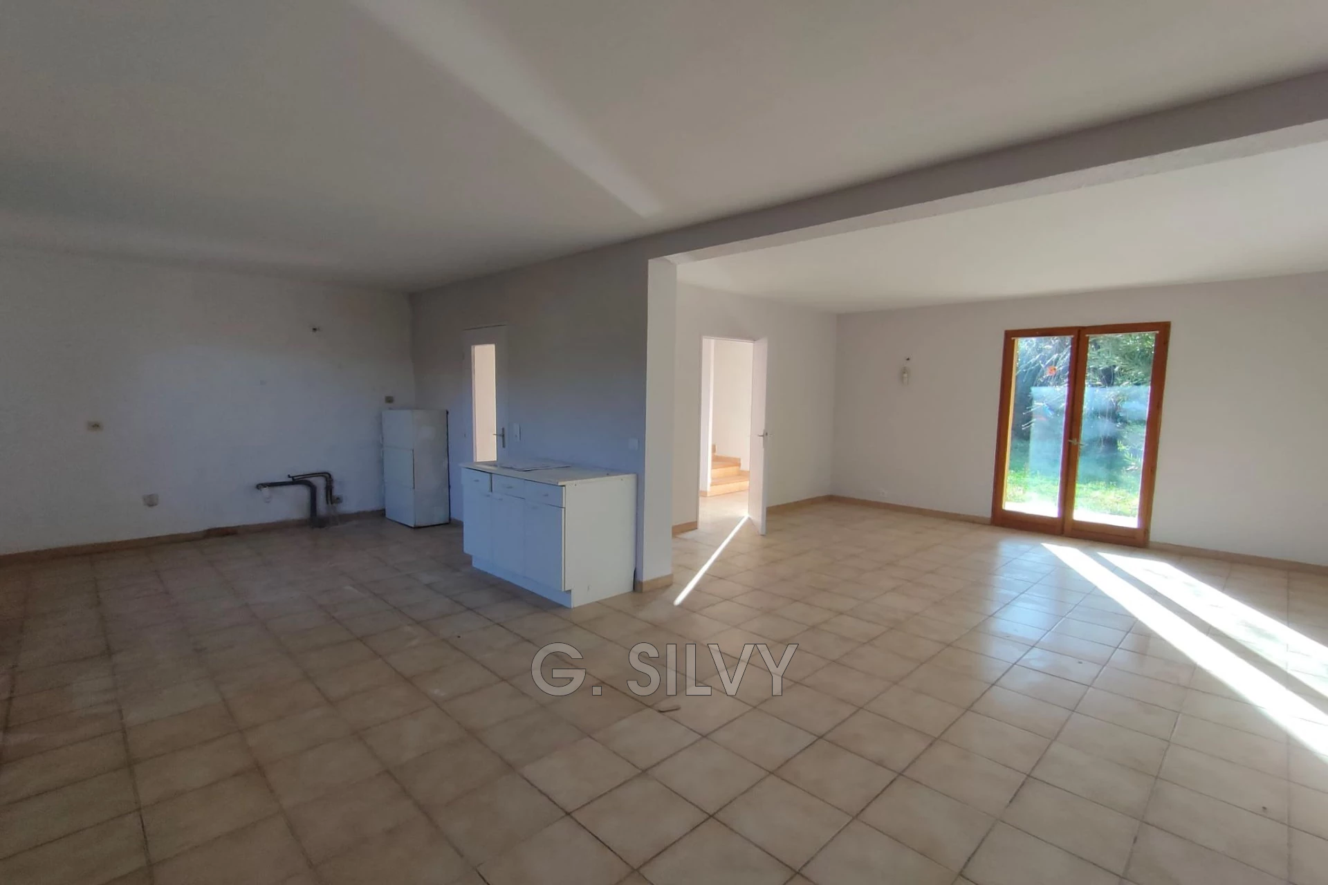 Au rez-de-chaussée, un hall d'entrée dessert un spacieux séjour de 37,72 m², lumineux et convivial, ouvert sur une cuisine à aménager. Un WC indépendant complète ce niveau.